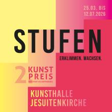 Vom 25. März bis 12. Juli 2026 präsentiert die Kunsthalle Jesuitenkirche die Preisausstellung „STUFEN – ERKLIMMEN. WACHSEN.“ mit den Beiträgen der 12 ausgewählten Finalist*innen.